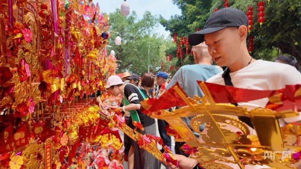 庙会现场设置古风市集、美食街区和工艺品集市等。古风市集上,摊主身着传统服饰经营,与游客开展互动;美食街区内,波罗粽等特色小吃香气四溢,摊位前不乏排队市民;工艺品集市上,风车、波罗鸡、香囊等传统手工艺品琳琅满目,成为游客祈福留念的热门选择。