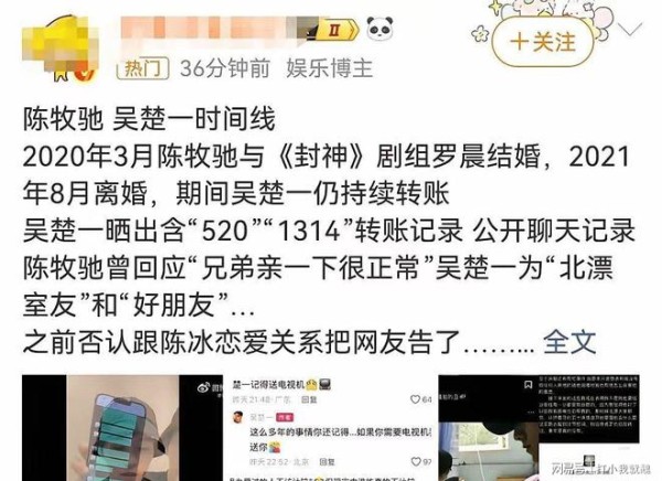 当年吴楚一为证明陈牧驰和自己的关系可谓“伤敌一千自损八百”,力证陈牧驰的同时也自曝自己和别人已婚生子等信息,只能说两个人都是半斤八两吧。