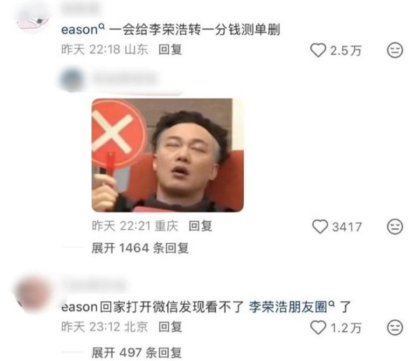 甚至已经有网友开始调侃,说回去以后,陈奕迅还得给给李荣浩转账一分钱测一下,有没有被李荣浩删除好友。