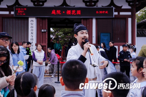 春和景明,西安青龙寺遗址景区内落英缤纷,游人如织。3月28日,以“长安春宴游园会”为主题的樱花季系列活动在此正式拉开帷幕,活动以“樱花+唐诗+文物”的复合型文旅体验,通过城市观光车进景区、老字号品牌联名以及沉浸式唐风互动,为市民游客打造一场可游、可赏、可品、可购的春日盛宴。