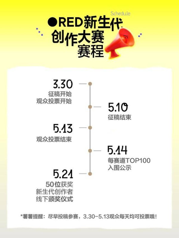 3月30日,小红书宣布正式启动首届“RED新生代创作大赛”,面向全平台创作者开放征稿。