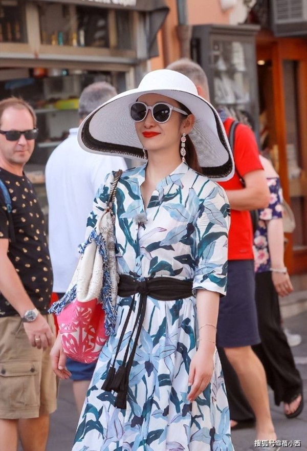 3,秦海璐穿印花连衣裙搭配宽檐帽