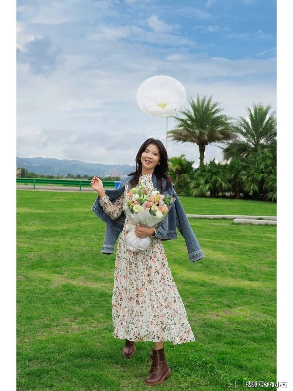 很多人觉得碎花连衣裙太甜腻,刘涛的搭配则走了另一种温柔路线,小碎花自带清新滤镜,和草坪蓝天的背景格外适配,花色淡雅清新,看起来一点都不杂乱,再加上连衣裙的材质垂坠感十足,宽松版型还可以藏住腰腹赘肉,搭配牛仔外套随性又减龄,刚柔并济的组合中和了裙装的甜腻,看起来不烂大街,时尚感拉满。