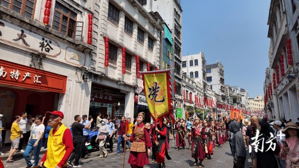 舞台演罢,热闹不减。茂名冼太舞队伍与海南本土“装军出游”队伍在海口骑楼建筑历史文化街区穿街而行,冼夫人军旗与海南本地民俗旗帜交相辉映,脚步所至,皆是欢呼。