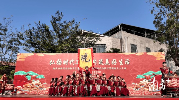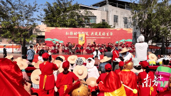 当天,在海南省海口市琼山区冯村广场上,舞龙舞狮、八音表演、公仔戏与琼剧轮番登场,搅热了春日的氛围。“咚咚咚!锵锵锵!”一阵急促的鼓点骤然响起,来自茂名的舞者身着“窄袖长裙、两当甲”服饰,迈着刚劲有力的步伐登场。他们左手持饼印、右手执短棍,短桥硬马的茂南洪拳招式融入舞蹈,步稳势烈间,冼家军征战沙场的英勇气势跃然舞台。