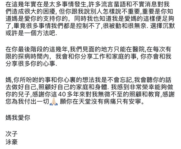 这些年来,李泳汉与李泳豪兄弟关系一直处于决裂状态之外,李泳豪与施明的母子关系也是外界所关注的。外界一直认为施明不满李泳豪的妻子,导致母子关系紧张,不过母子关系也不如外界所言。在施明离世之后,李泳豪终于写下了一篇长文表达对母亲的思念与悼念。他在文中分享了从小到大与母亲一起的点点滴滴,最后还提到与母亲的关系,他表示与母亲关系一直很好,没有受到外界的流言蜚语所影响。不过他也承认在母亲人生的最后这几年,母子见面只能在医院,每次见面时间都极为短暂。