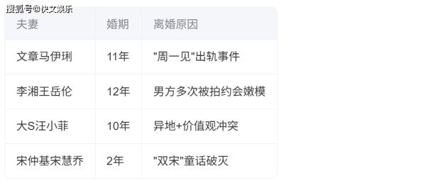 黄晓明Angelababy(婚期7年)被曝婚前签3亿财产协议; 王宝强马蓉(婚期7年)因经济纠纷反目成仇。3. 真人秀成"婚姻照妖镜"