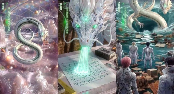 经过多方合力,最终得以呈现一部非常完整的年轻人面对AI巨变的想象力叙事。开篇人类世界如幻彩的城堡,此时AI化作银身绿眸巨龙降世,背景各异的哇人从都市、沙漠、星际、工作室、图书馆、雅典神庙集结,与巨龙对抗。而巨龙变幻出诸般面孔,似有所诉,似与哇人共舞。