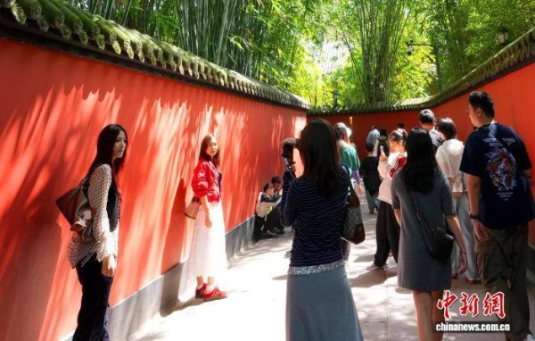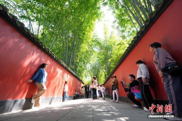 4月4日是清明假期首日,成都武侯祠博物馆迎来大量游客。馆内主要景点如刘备殿、诸葛亮殿前人头攒动,游人如织。来自全国各地的游客趁着假期前来缅怀先贤、了解三国历史,感受传统文化氛围。图为游客在武侯祠红墙夹道拍照留念。中新社记者 安源 摄