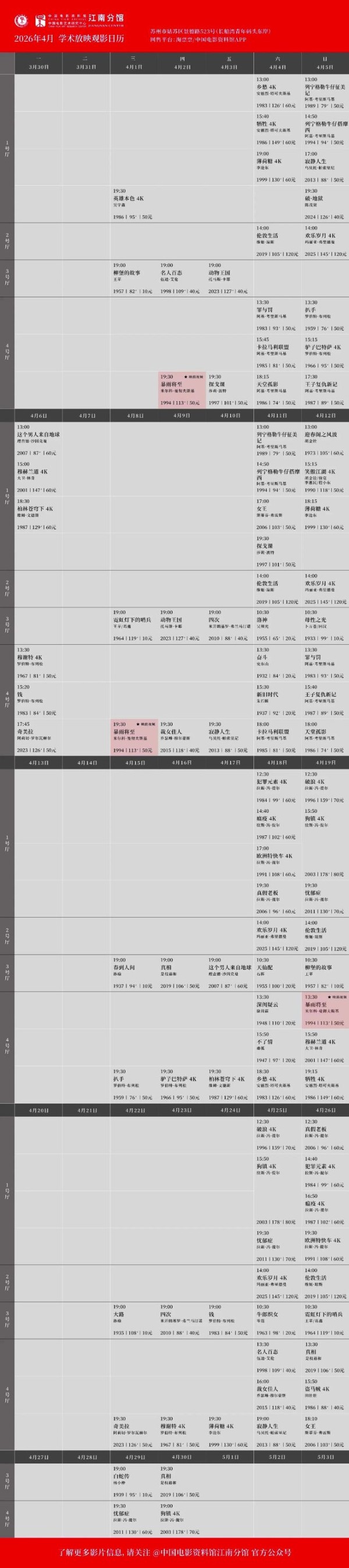今天4月5日是中国传统的清明节,北京停映一天明日恢复;苏州江南分馆正常放映,并选择两部高分佳作做特别放映。以下是今日放映信息,具体时间见贴图。