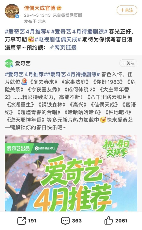 值得一提的是,该剧由爱奇艺、欢瑞世纪出品,早期宣传口径也一直是爱奇艺独播。尽管目前已出现在腾讯视频4月片单中,但剧集官方微博的最新宣传物料里,仍未增设腾讯视频的预约入口与联动信息。