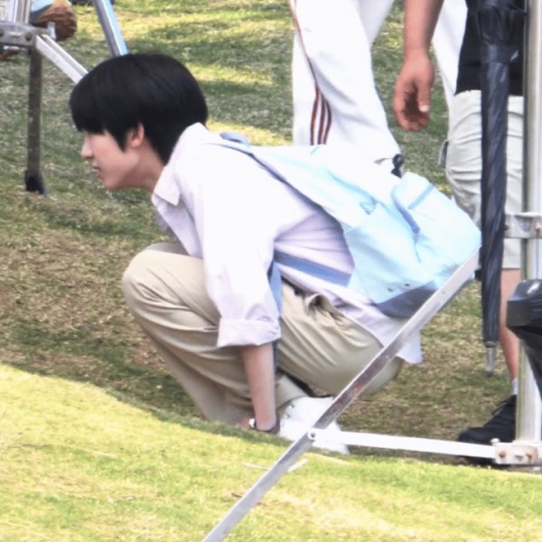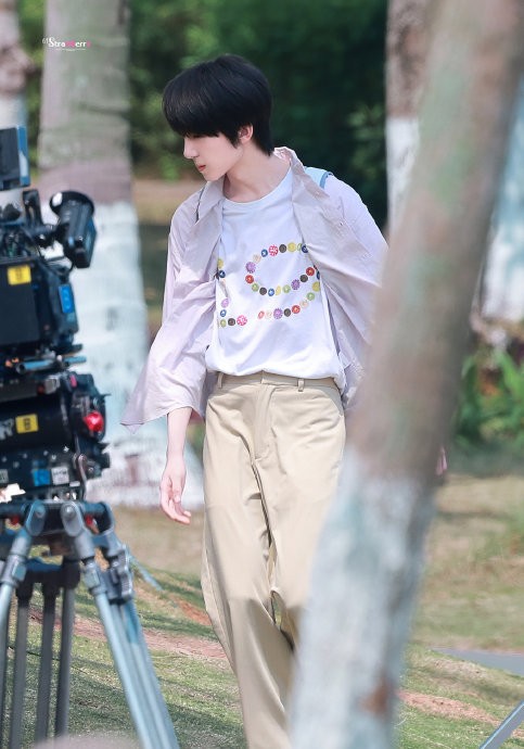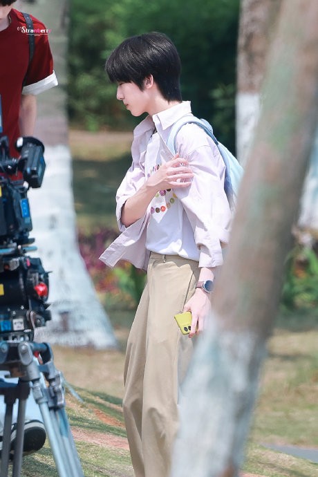 杨博文粉衬衫背书包亮相《我们少年时代2》路透