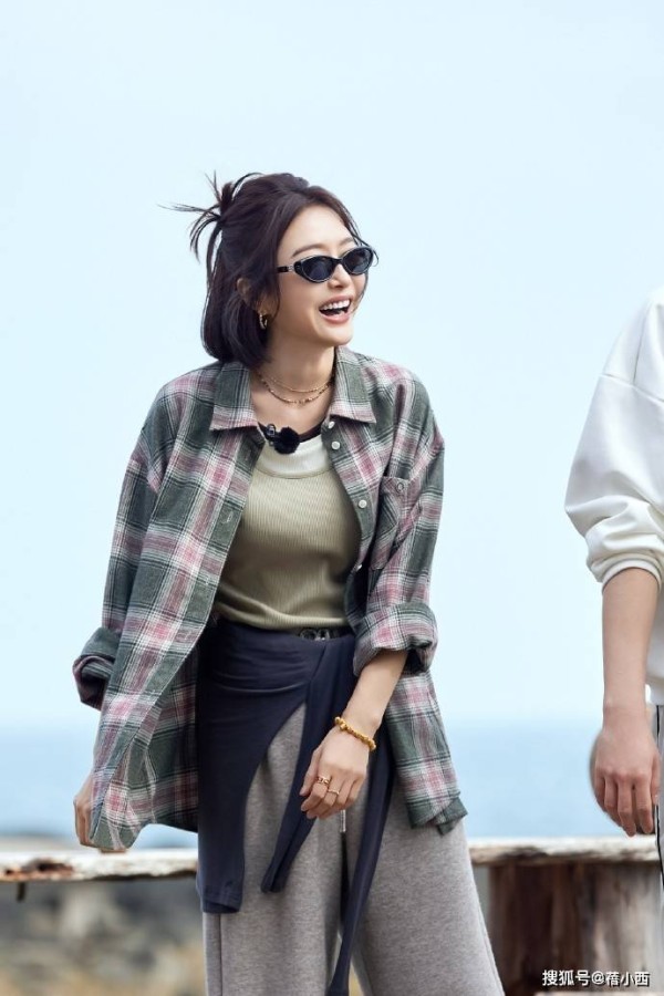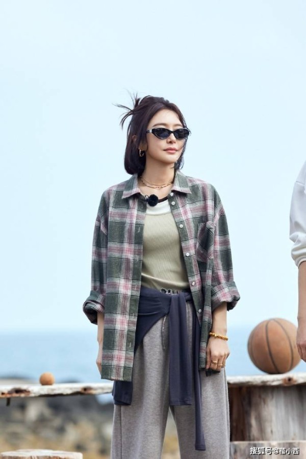 秦岚选择了随性的半扎短发,把头顶部分头发松松抓起来扎成小揪,留着脸颊两侧的碎发修饰脸型,发尾自然垂在肩颈,还带了点凌乱的氛围感,慵懒又减龄。先来看内搭,很可能是一件背心,其版型略微修身,而且领口加入了撞色设计,简约又带点小心机,把身材线条衬得很流畅。外面叠穿了一件宽松的格纹衬衫,主色调是复古的墨绿,混着粉白线条,格纹大小适中不杂乱,让人看一眼便会喜欢。
