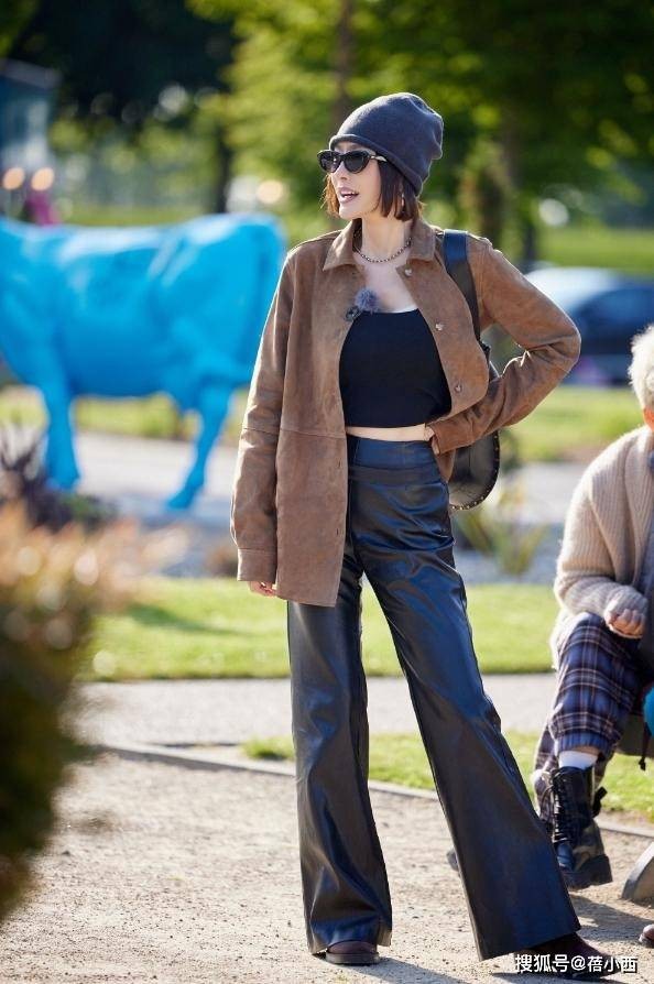上身穿的衬衫是焦糖色麂皮质感,衣服长度盖过胯部,袖子松松垮垮的,具有不错的藏肉效果。内搭是一件纯黑色短款抹胸,贴着身体肌肤,露出了腰腹肌肤,顺带把腰线抬高了。腿上的皮裤是垂感超棒的阔腿款,裤脚堆在鞋面上,把腿衬得又直又长,