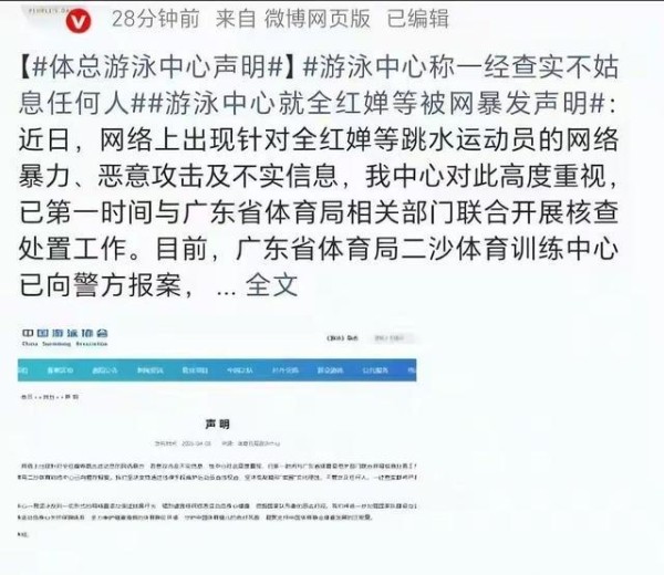 广东省二沙体育训练中心4月8日下午正式报案。国家体育总局游泳中心同步发声,原话是:“不管涉及任何人,一经查实,严肃处理,绝不姑息。”周继红作为中心负责人,没开发布会,但内部消息说,这次调查是联合公安、网信、纪检三线推进,不是走过场。