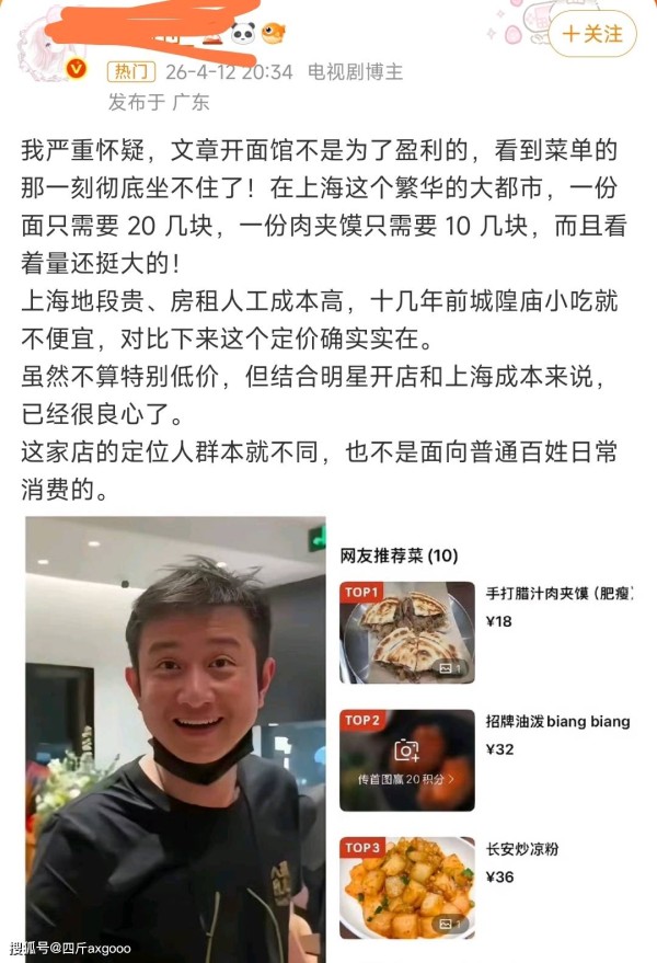 4月13日,娱乐圈知名演员文章在上海开陕西面馆的事情持续发酵。