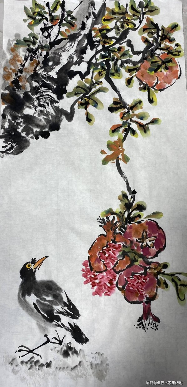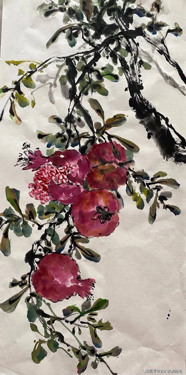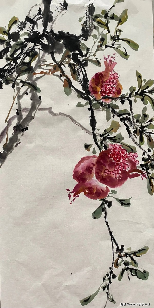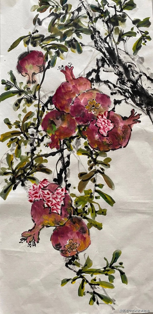 其石榴作品融合工笔细腻与写意洒脱,果实设色写实中见灵动,橙红斑驳的果实在浓淡墨叶映衬下饱满鲜活;枝干以阔笔挥写,虬曲苍劲间尽显笔墨张力,黑白灰的墨色对比更添画面厚重感。作为马卫巍先生弟子,她深得恩师大写意花鸟精髓,既传承“意在笔先”的创作理念,又以女性视角赋予作品温润雅致的气质,将石榴“多子多福、吉祥美满”的传统寓意,化作笔端流转的诗意与生机。