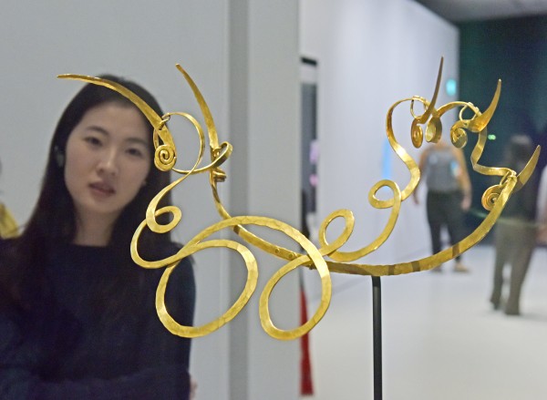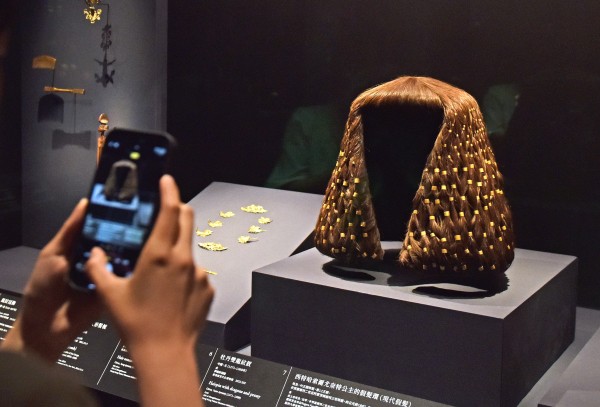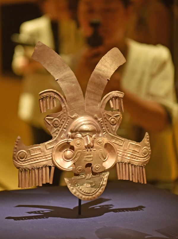 4月14日,媒体记者在拍摄哥伦比亚头饰。 新华社记者 陈铎 摄