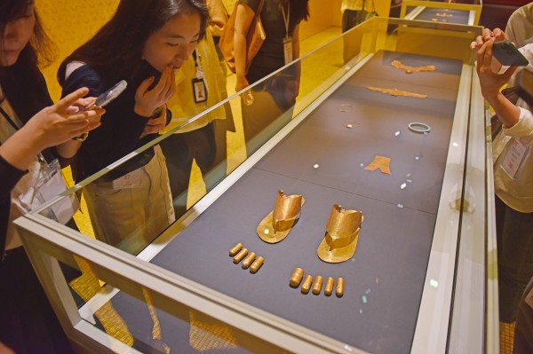 4月14日,媒体记者在参观埃及脚趾套和拖鞋。 新华社记者 陈铎 摄