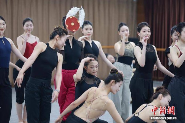4月14日,辽宁歌舞团举办《古色·国宝辽宁》排练开放日活动。媒体记者、粉丝观众与汉服爱好者齐聚一堂,共同走进排练一线,近距离感受国宝文物与舞台艺术交融的独特魅力,为剧目本周末正式演出提前预热。图为演员在排练中。中新社记者 于海洋 摄
