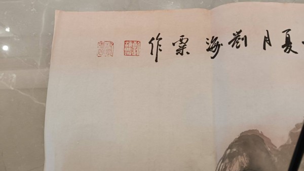 - **干湿互衬**:在泼洒过程中,刘海粟精准控制墨色与色彩的干湿程度,干笔皴擦表现山石的粗糙质感,湿笔晕染凸显云海的流动质感,干湿对比,让画面充满了节奏与韵律。