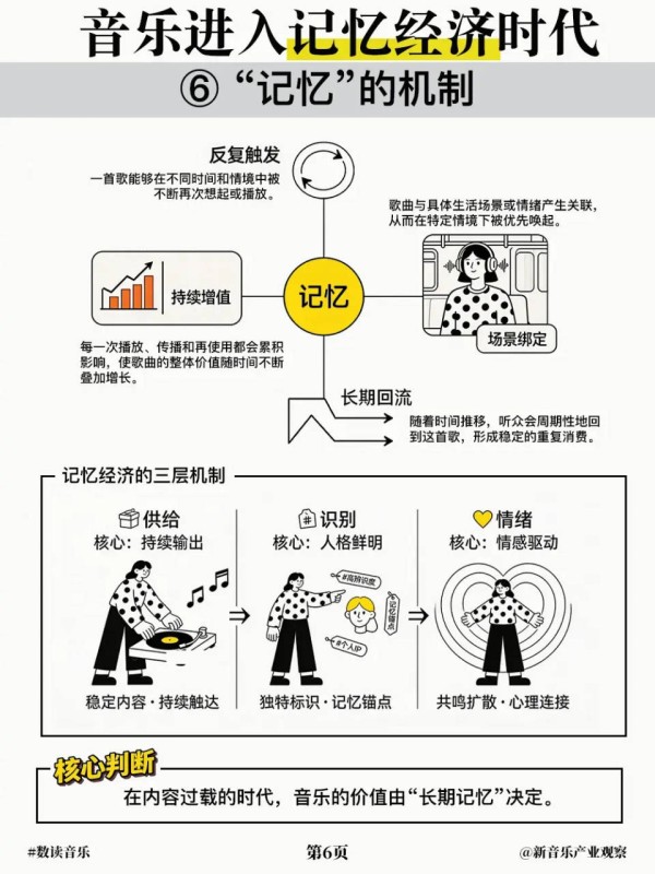 因此,我认为,排行榜的规则干预无法改变市场趋势,在内容过载的市场中,“注意力法则”已经淡化,如今的听众选择歌曲更多靠“记忆”。