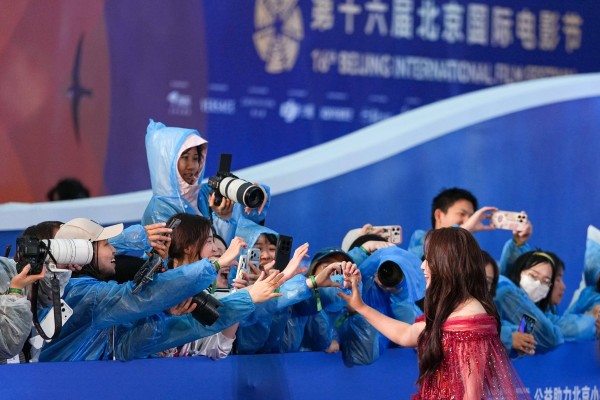 4月16日,演员江疏影在开幕红毯上与影迷互动。 新华社记者 鞠焕宗 摄
