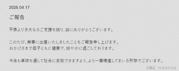 4月17日,已经生产有一段时间的福原爱,更新社交媒体动态,宣布三胎孩子出生,透露母子平安,目前状况良好,已经投入到工作状态。