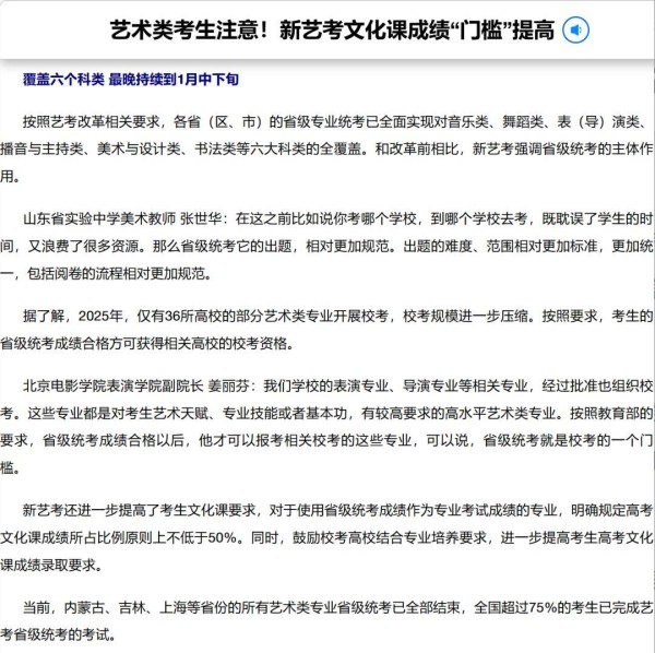 [1]新华网:艺术类考生注意!新艺考文化课成绩“门槛”提高