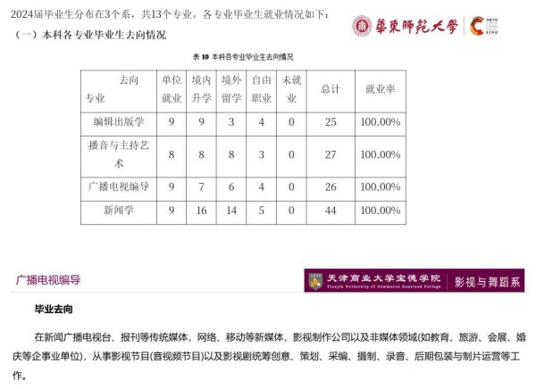 [5]华东师范大学传播学院 2024 届毕业生就业质量报告显示,广播电视编导本科毕业生的去向分布是:单位就业 9 人、境内升学 7 人、境外留学 6 人、自由职业 4 人,共 26 人。