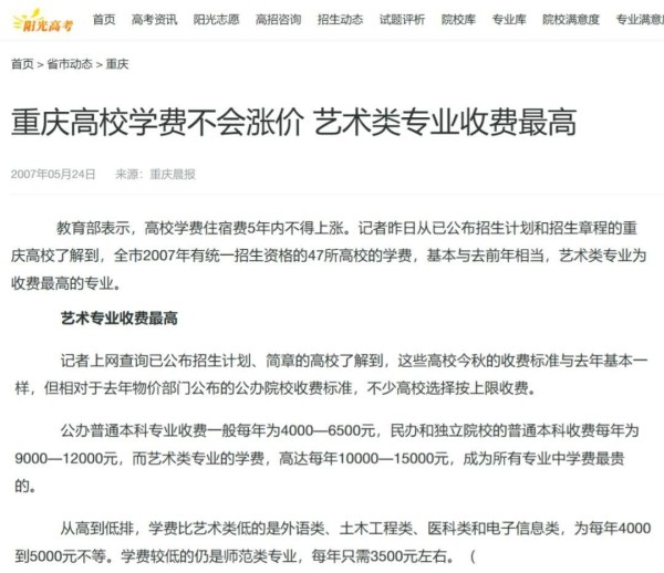 [4]在2007年的重庆,公办普通本科专业收费一般每年为4000-6500元,民办和独立院校的普通本科收费每年为9000-12000元,而艺术类专业的学费,高达每年10000-15000元,成为所有专业中学费最贵的。