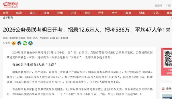 [8]2026年联考公务员平均报录比约为47:1,即每100名考生中,仅有约2人能够最终上岸。以2026年度陕西事业单位报名为例,一个“三不限”岗位(不限专业、户籍、学历)的竞争比高达603:1。