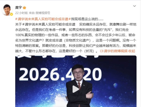 比如,他在大会上畅想AI表演与AI演员,并认为未来真人实拍可能会成非遗,大概的意思就是,未来可能所有表演都会有AI的参与,所以100%的真人表演越来越少,所以,真人表演“会不会过多少年以后,被命名为世界文化遗产?”