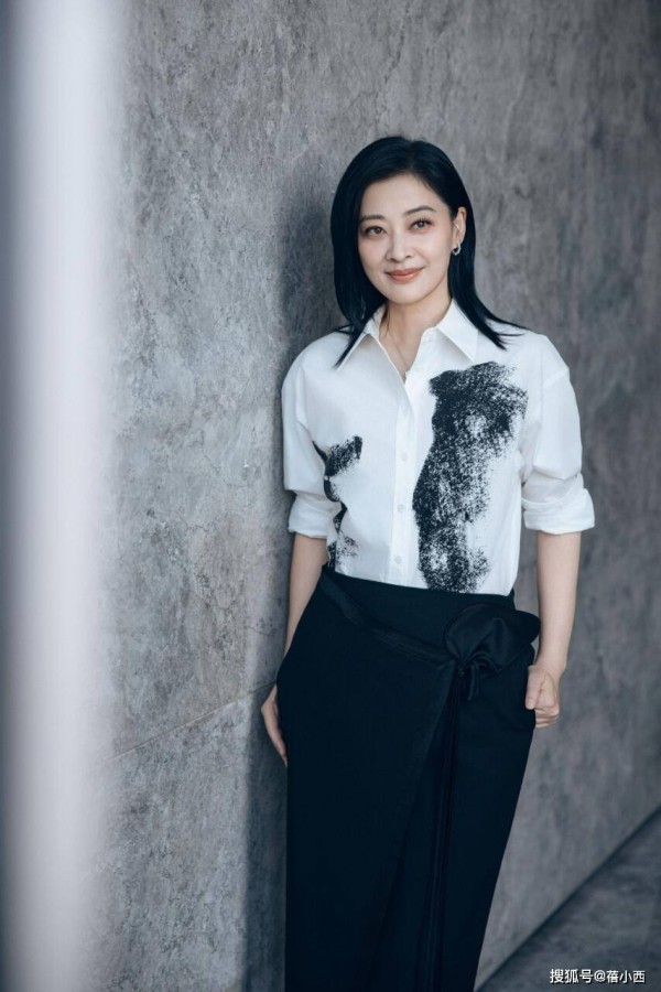 梅婷的这一套黑白穿搭,简直是职场穿搭的天花板。一件带着水墨印花的白衬衫,搭配一条利落的黑色半身裙,再踩上一双简约的白色方头穆勒鞋,整套 look 没有多余的装饰,干练还高级。