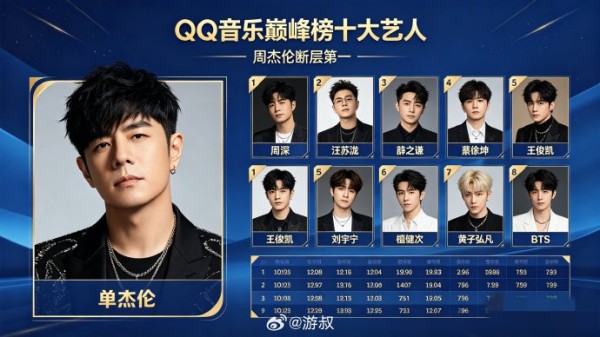 QQ音乐首季十大艺人公布,周杰伦蔡徐坤BTS等上榜