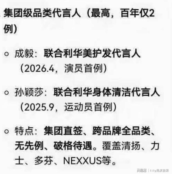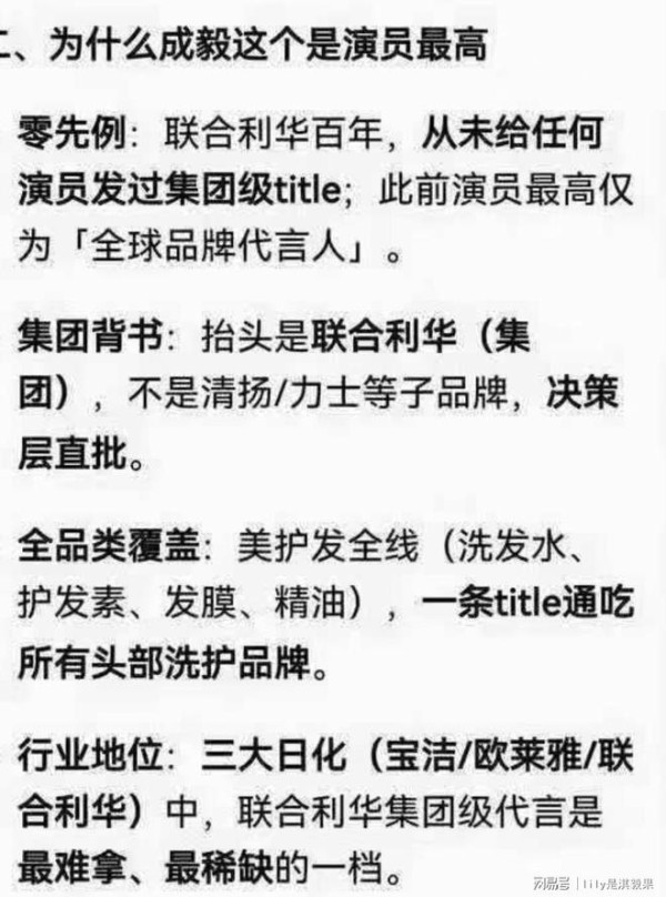 先给大家掰扯清楚最关键的含金量:成毅的title是「联合利华美护发代言人」,抬头写的是联合利华集团,不是多芬、清扬、力士这些子品牌,是集团直签的合作!