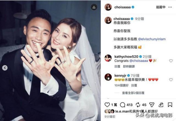 她在发文中难掩喜悦之情,大方写下“恭喜我嫁你,恭喜你娶我,以后请多多指教”,并晒出婚戒。