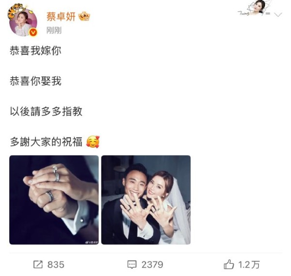 蔡卓妍官宣结婚了?啊啊啊啊啊啊和之前那个小她十岁的健身教练林俊贤结婚了?!!!!